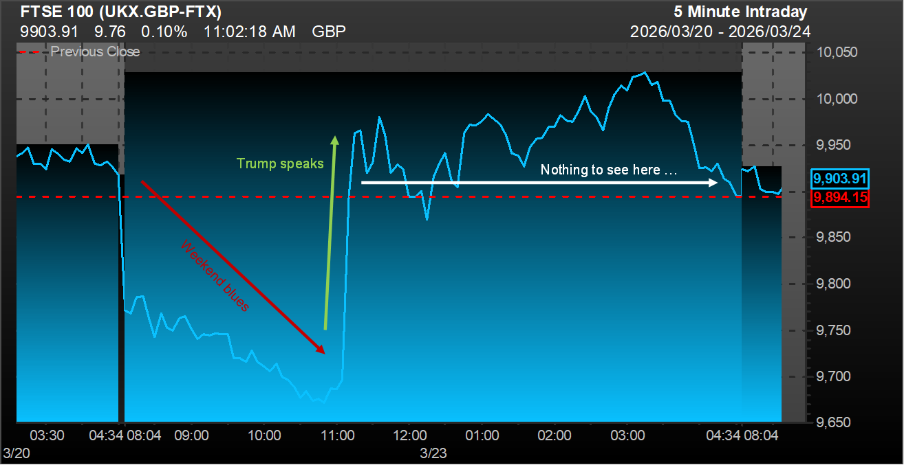 Then Donald Trump opened his mouth. And so, before we even reached lunchtime, the market had turned positive for the day, and spent the rest of the afternoon acting as if nothing had happened: