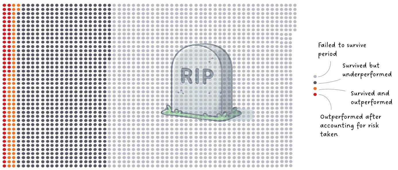 The graphic below demonstrates this hard truth. Over 20 years a majority of professionally managed active funds failed to survive. Of those that did survive only a minority (14%) beat the market, and of those only around half outperformed after accounting for the risk taken. These risk-adjusted outperformers account for just 2% of the starting sample of funds. Attempting to choose these funds in advance is an exceptionally difficult – perhaps impossible - task.